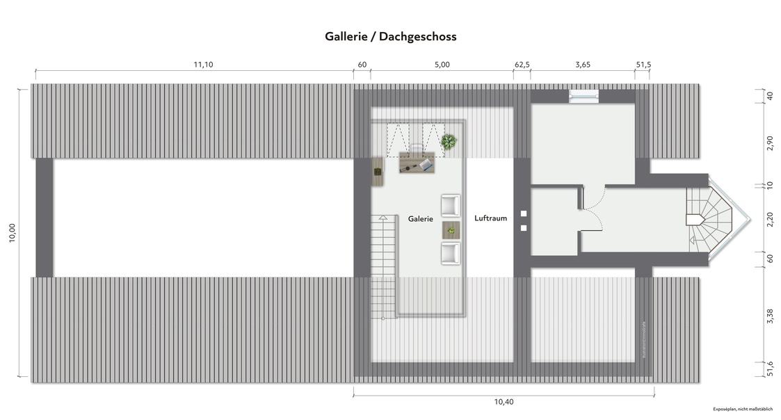 Noch eine Treppe höher und Sie stehen in der Galerie. Der Blick geht hinunter in den Wohnbereich